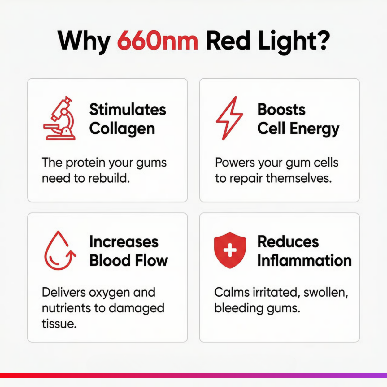 Yes. Red light at 660nm stimulates collagen production, increases blood flow, and promotes cellular regeneration in gum tissue. With consistent daily use, customers report visibly healthier, thicker gums and significantly reduced sensitivity within 2–8 weeks.